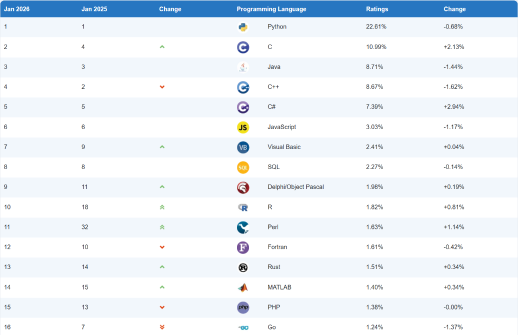 编程语言R以完美契合统计学家和数据科学家的需求而闻名。随着统计学与大规模数据可视化的日益重要,R 语言重新获得青睐。这一趋势同样体现在Wolfram/Mathematica(另一款功能相似的工具)的崛起上,该工具本月重返前 50 名。