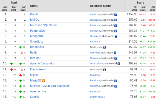 2026年3月 DB-Engines 数据库排名,前6名没有变化,Databricks上升了一名,Redis和Elasticsearch下降了。