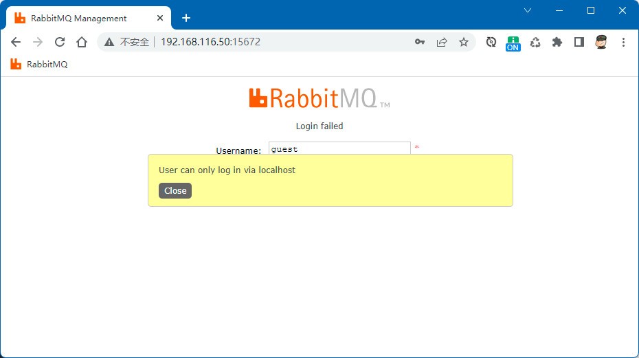 (2)使用浏览器访问 http://192.168.116.50:15672 地址,笔者可以根据自己实际服务器 IP 地址替换 URL 中的 IP 地址。当我们成功访问到页面后,使用 guest 账户登录报错,如下图: