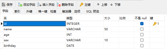 "insert into t_user(id, name,age,sex,birthday) values (?,?,?,?,?)");
