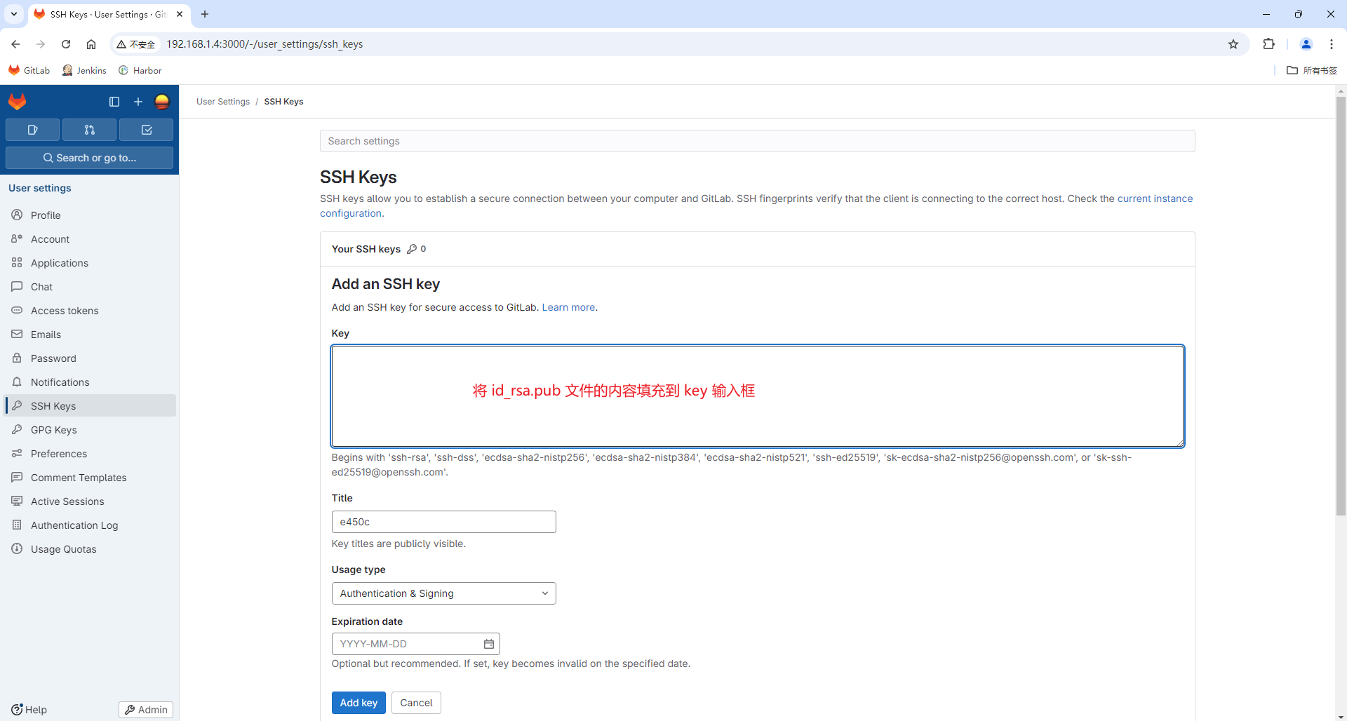 登录到 gitlab,点击“Add SSH key”按钮添加 SSH KEY,如下图: