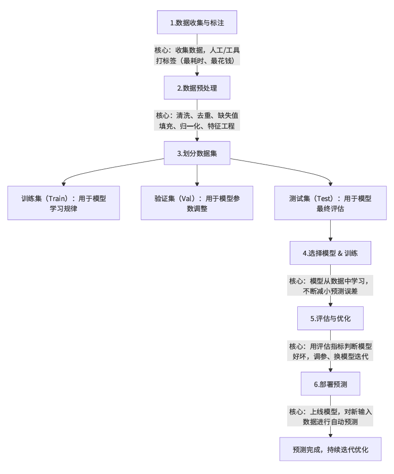 (3)数据集:由大量特征与标签一一对应的样本对(X, Y)组成,是模型学习规律的基础素材。