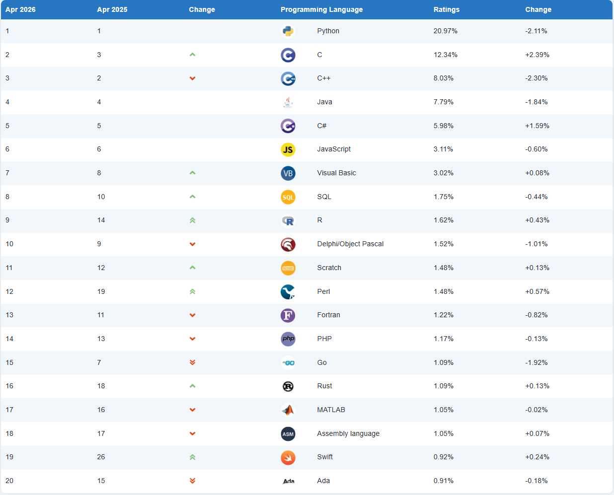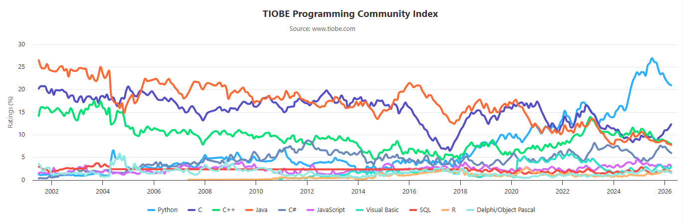 Rust 是 TIOBE 指数前 20 名中最年轻的编程语言。它于 2020 年 6 月首次跻身前 20 名,当时外界普遍预计它将闯入前十,成为 C 和 C++ 的有力竞争对手。这已是近六年前的事了。此后,Rust 的排名稳步攀升,甚至在今年年初达到了历史最高位次(第 13 位)。然而仅仅三个月后,它便回落至第 16 位。这表明 Rust 的普及速度可能已趋于平稳。一种可能的解释是,尽管 Rust 能够生成高效且安全的代码,但对于非专业程序员而言,其学习难度依然较高。虽然性能关键领域的技术专家愿意投入精力掌握这门语言,但其更广泛的主流普及仍面临较大挑战。因此,Rust 的人气增长似乎正在趋于平缓,如今跻身前十的目标显得比以往更加遥远。