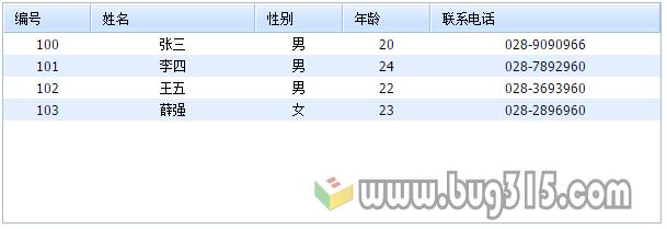 <?xml version="1.0" encoding="UTF-8"?> <rows> <row id="0"> <cell>100</cell> <cell>张三</cell> <cell>男</cell> <cell>20</cell> <cell>028-9090966</cell> </row> <row id="1"> <cell>101</cell> <cell>李四</cell> <cell>男</cell> <cell>24</cell> <cell>028-7892960</cell> </row> <row id="2"> <cell>102</cell> <cell>王五</cell> <cell>男</cell> <cell>22</cell> <cell>028-3693960</cell> </row> <row id="3"> <cell>103</cell> <cell>薛强</cell> <cell>女</cell> <cell>23</cell> <cell>028-2896960</cell> </row> </rows>