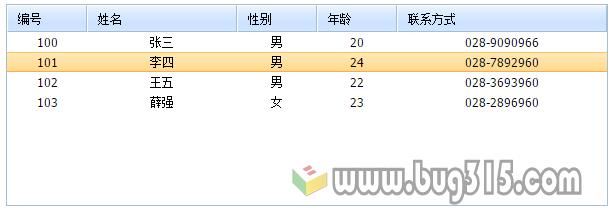<?xml version="1.0" encoding="UTF-8"?> <rows> <head> <column width="80" type="ro" align="center" color="white" sort="int">编号</column> <column width="150" type="ro" align="center" color="white" sort="str">姓名</column> <column width="80" type="ro" align="center" color="white" sort="str">性别</column> <column width="80" type="ro" align="center" color="white" sort="int">年龄</column> <column width="*" type="ro" align="center" color="white" sort="str">联系方式</column> </head> <row id="0"> <cell>100</cell> <cell>张三</cell> <cell>男</cell> <cell>20</cell> <cell>028-9090966</cell> </row> <row id="1"> <cell>101</cell> <cell>李四</cell> <cell>男</cell> <cell>24</cell> <cell>028-7892960</cell> </row> <row id="2"> <cell>102</cell> <cell>王五</cell> <cell>男</cell> <cell>22</cell> <cell>028-3693960</cell> </row> <row id="3"> <cell>103</cell> <cell>薛强</cell> <cell>女</cell> <cell>23</cell> <cell>028-2896960</cell> </row> </rows>