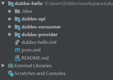 上图中,dubbo-hello程序有3个子模块,分别为 dubbo-api(定义我们的服务接口)、dubbo-provider(服务接口的具体实现,也是我们要暴露出去的服务)和dubbo-consumer(服务消费者)。下面将分别对他们进行详细讲解。