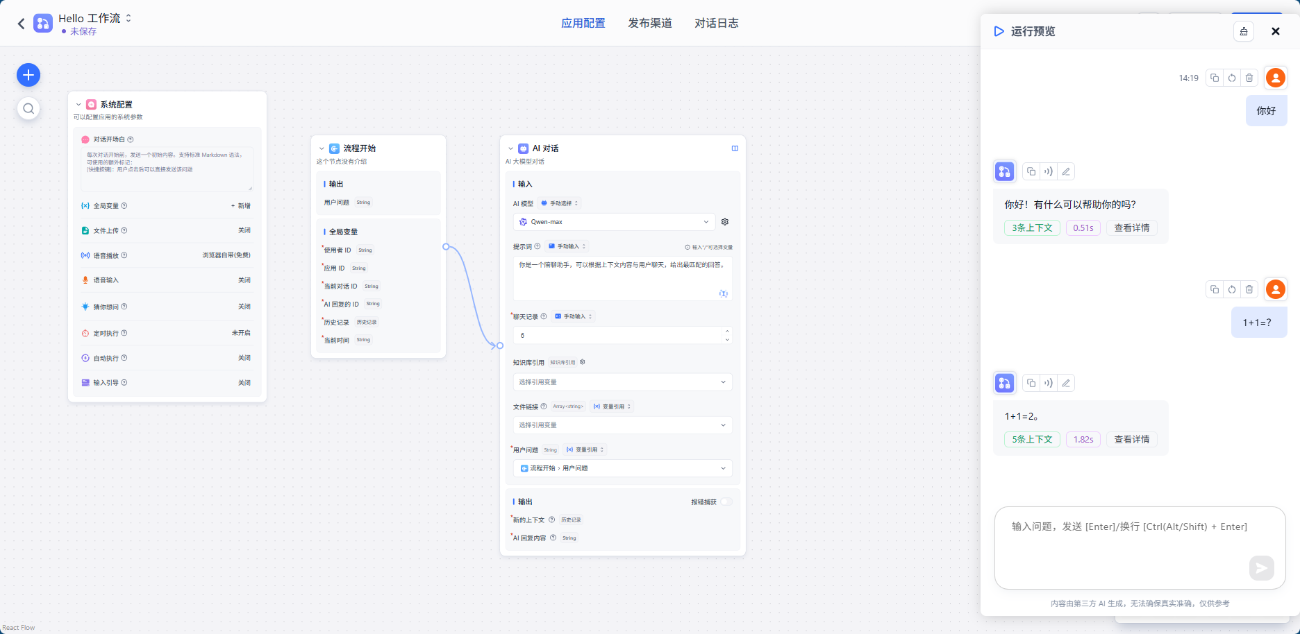 在运行预览界面的输入框中输入你的问题,查看效果,如下图: