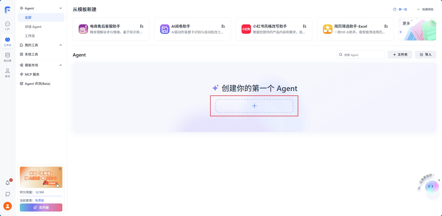 在创建 Agent 的页面,选择 Agent 类型为“工作流”,然后输入工作流名称“Hello 工作流”,点击“创建”按钮创建工作流。如下图: