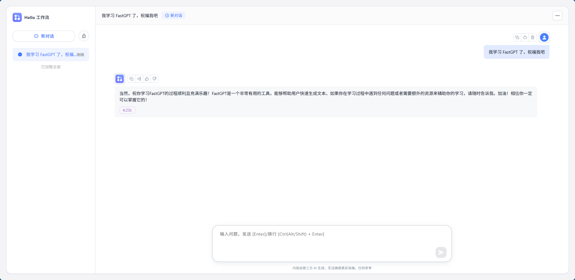 到这里,如何使用 FastGPT 创建流程就结束了,是不是很简单。