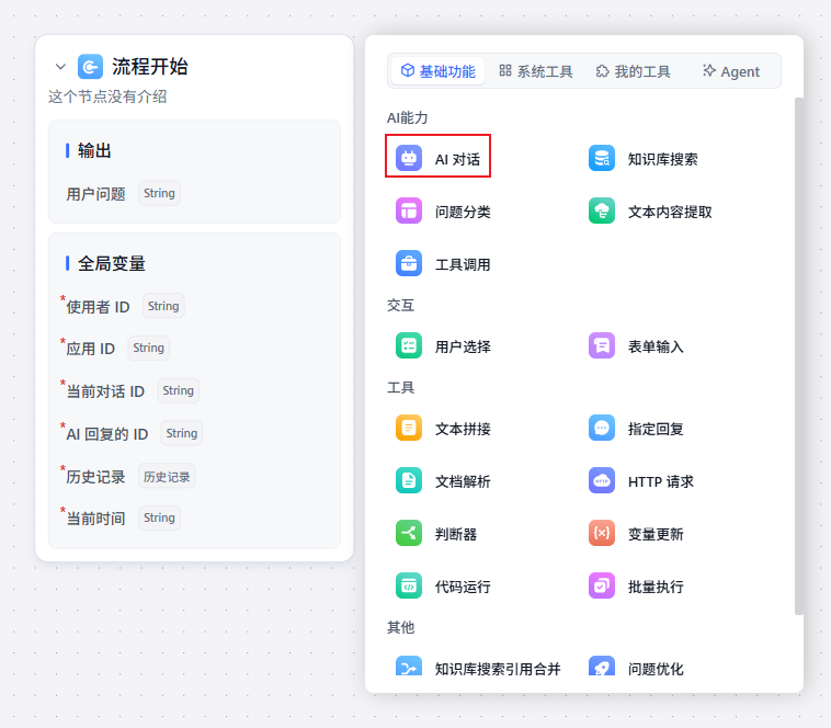 上图中,提供了很多节点,每个节点的具体用途后续将详细介绍,这里直接选择“AI 对话”类型的节点即可。