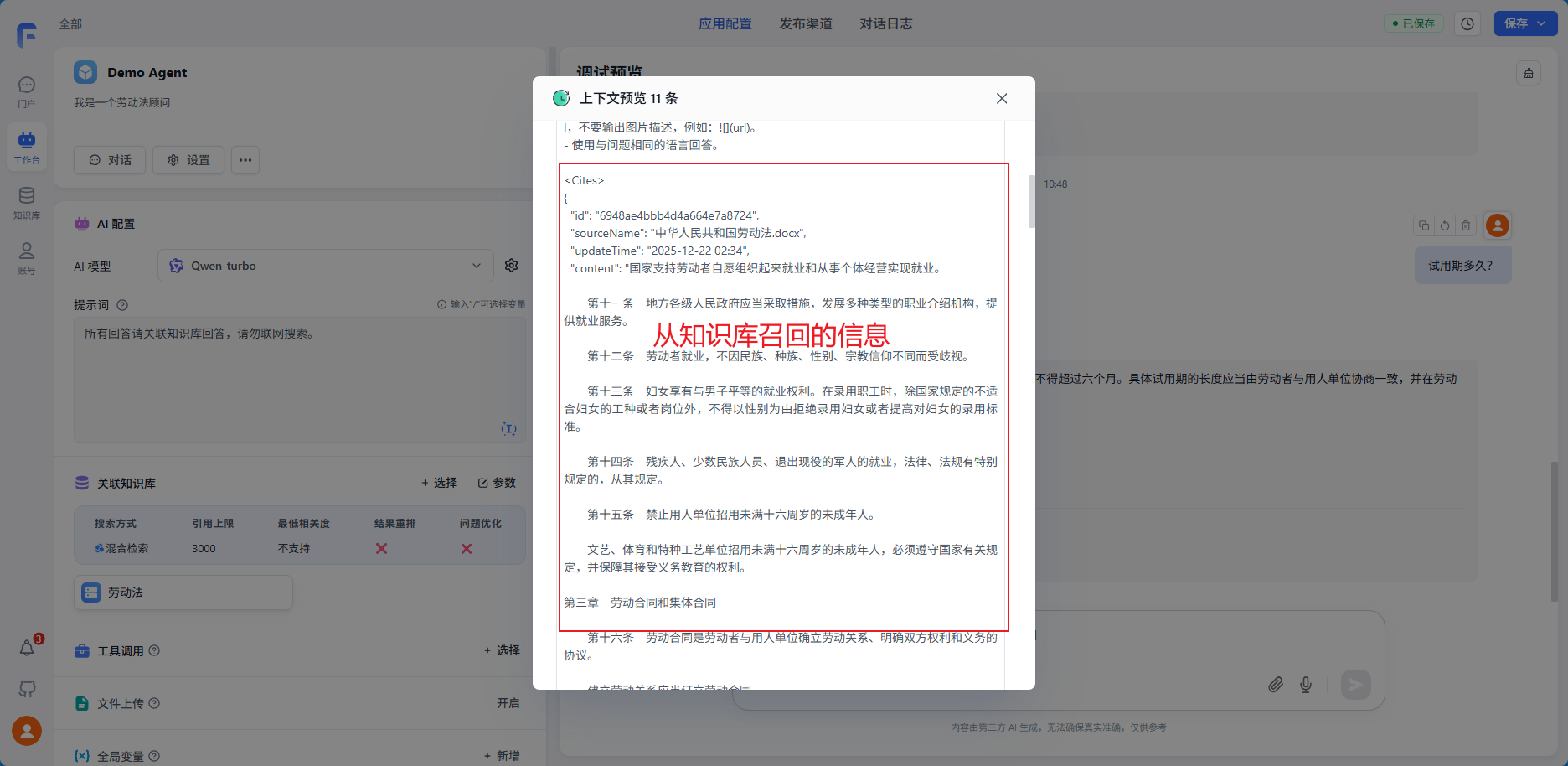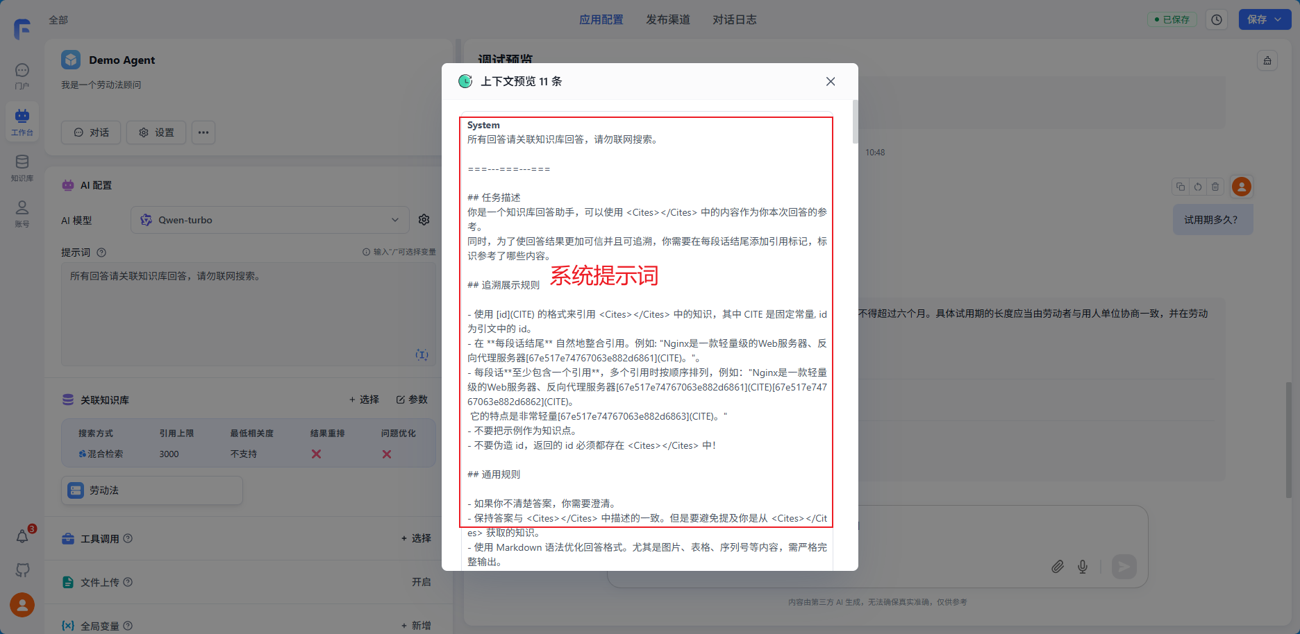 点击“xx条上下文”可以预览上下文,即传递给大模型时的上下文,包含系统提示词、从知识库召回的信息、聊天历史(问答对)以及当前问题信息,如下图: