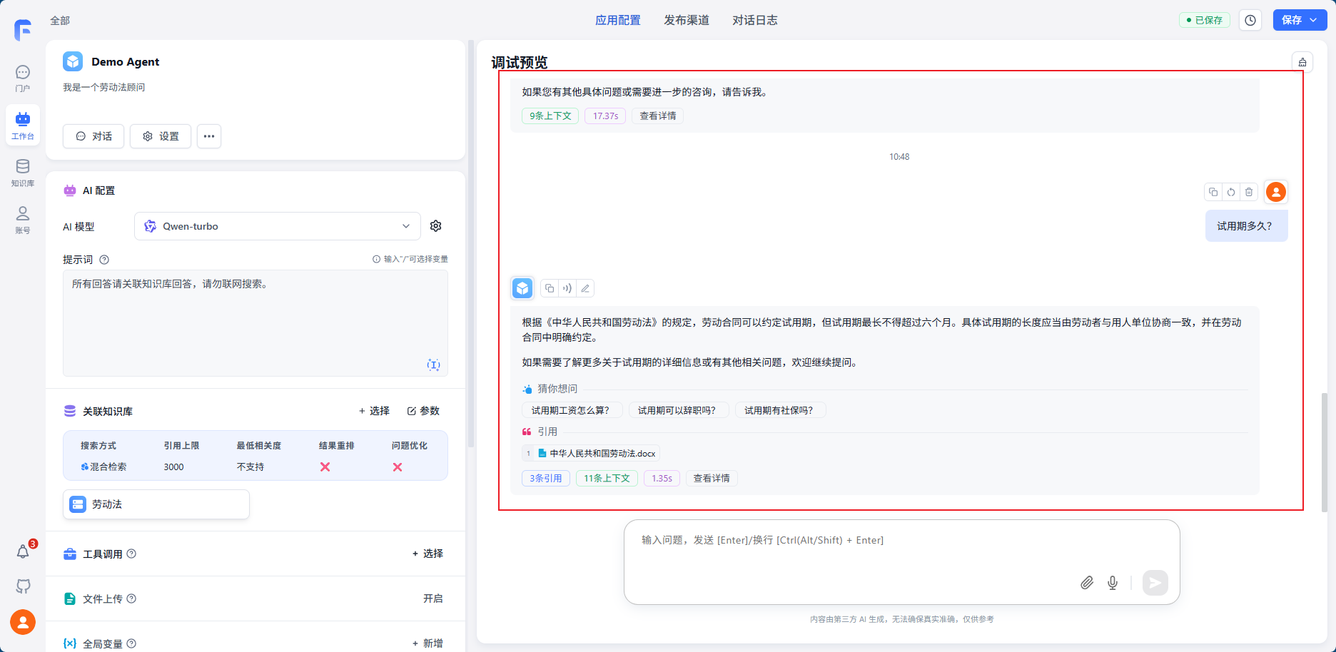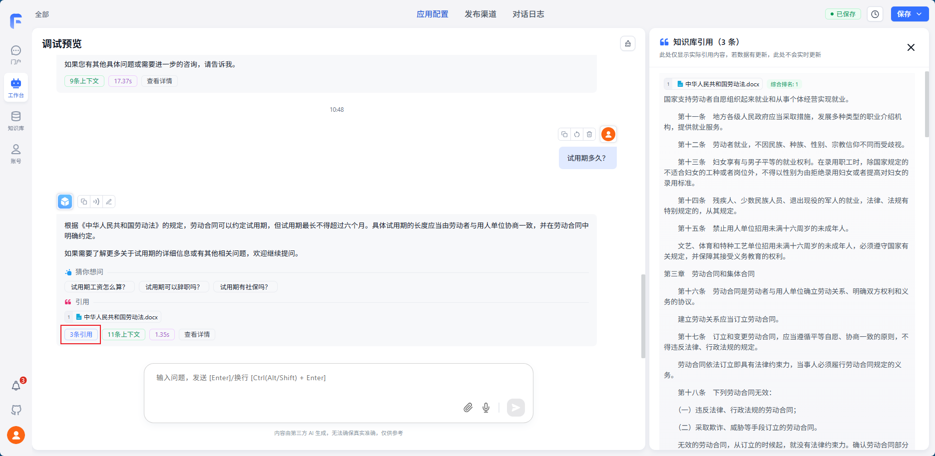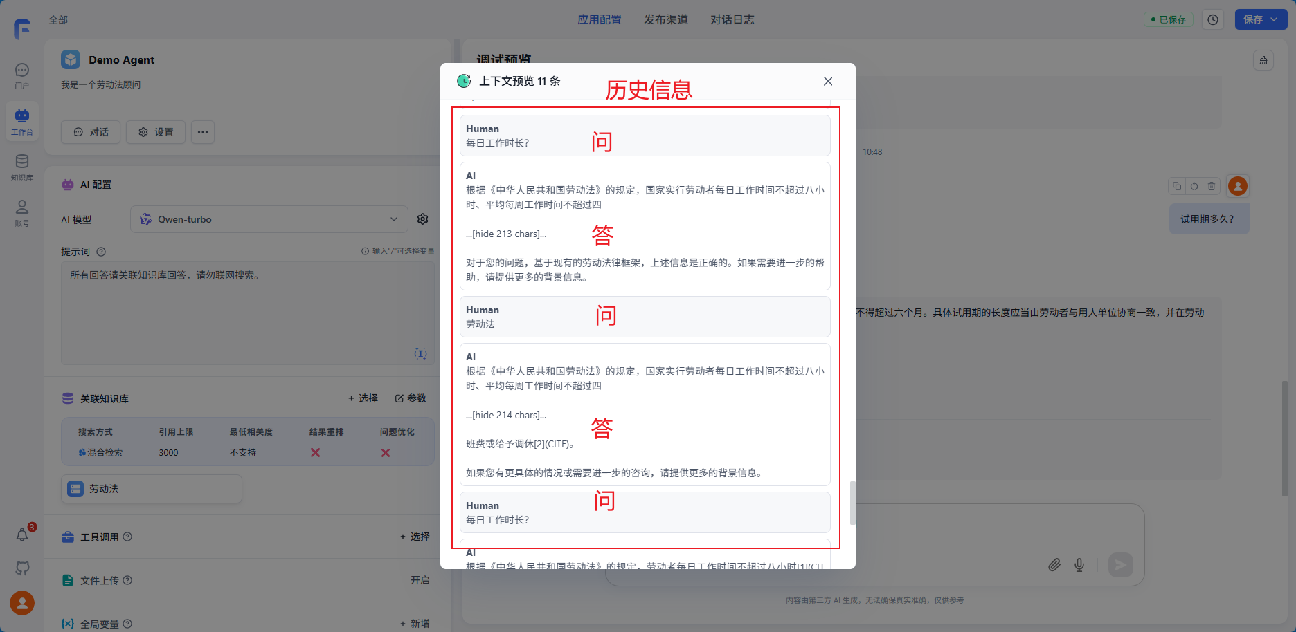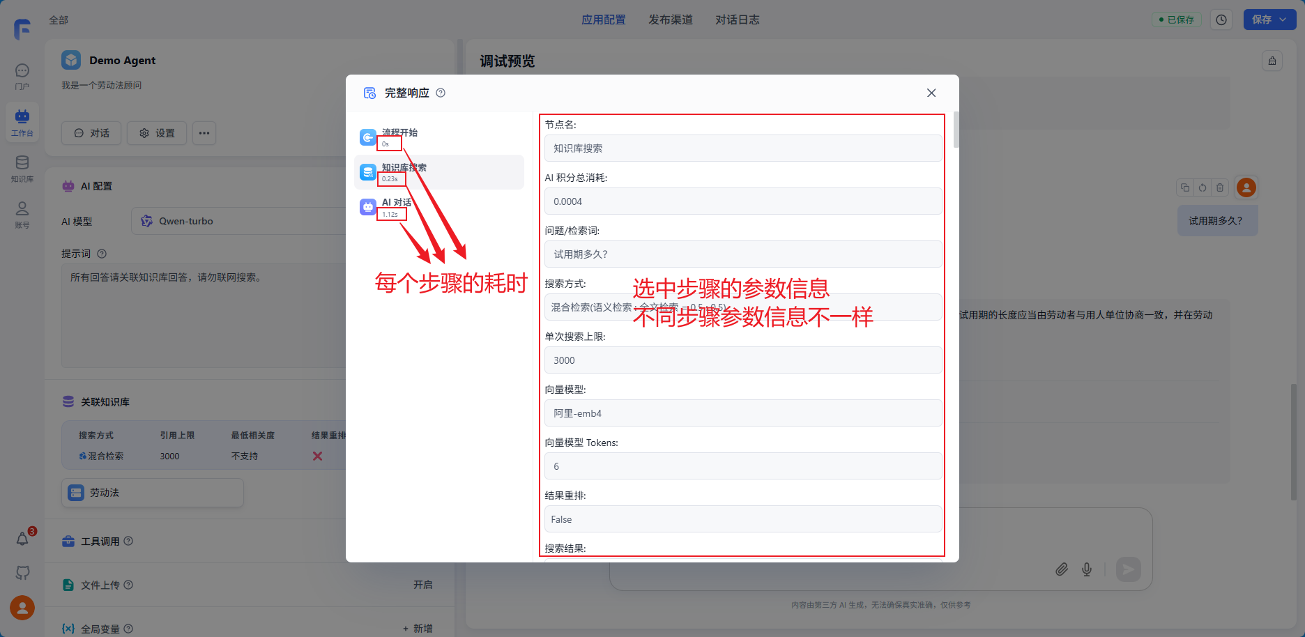 AI 回答靠列表左边显示,允许用户查看上下文信息,耗时以及详情信息。如果使用了知识库,还会显示回答问题使用了知识库的哪些文档和片段。