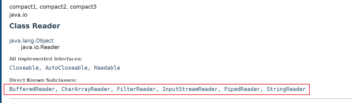 Java Reader 是 Java IO API 中所有 Reader 的基类。子类包括 BufferedReader、PushbackReader、InputStreamReader、StringReader 等,如下图: