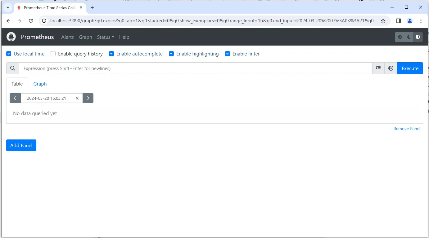 此时,需要用到 Prometheus 内置的表达式浏览器,请访问 http://localhost:9090/graph 并选择 "Table" 选项卡: