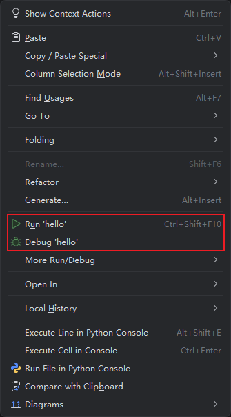 在 hello.py 编辑器中右击,打开右键菜单,选择“Run 'hello'”运行 hello.py 代码,如下图:
