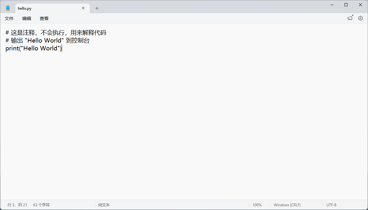 下面将分别演示如何使用记事本、VS CODE 和 PyCharm 工具运行第一个 Python 程序: