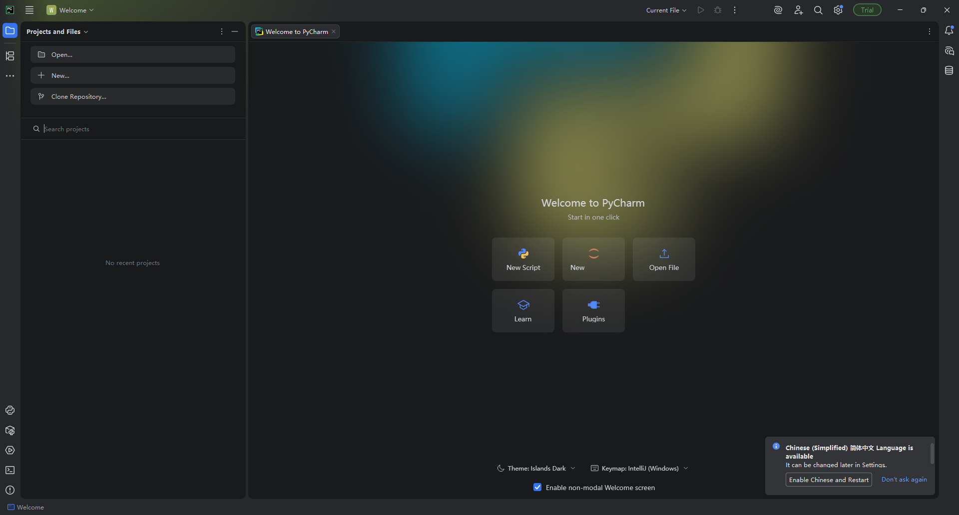 如果不需要,则选择“Skip Import”跳过配置导入。直接进入到 PyCharm 的主页面,如下图: