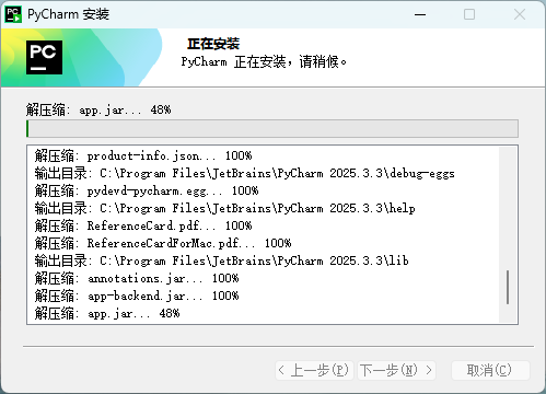 (5)PyCharm 安装中,需要等待几分钟,根据机器硬件不同约有不同,如下图: