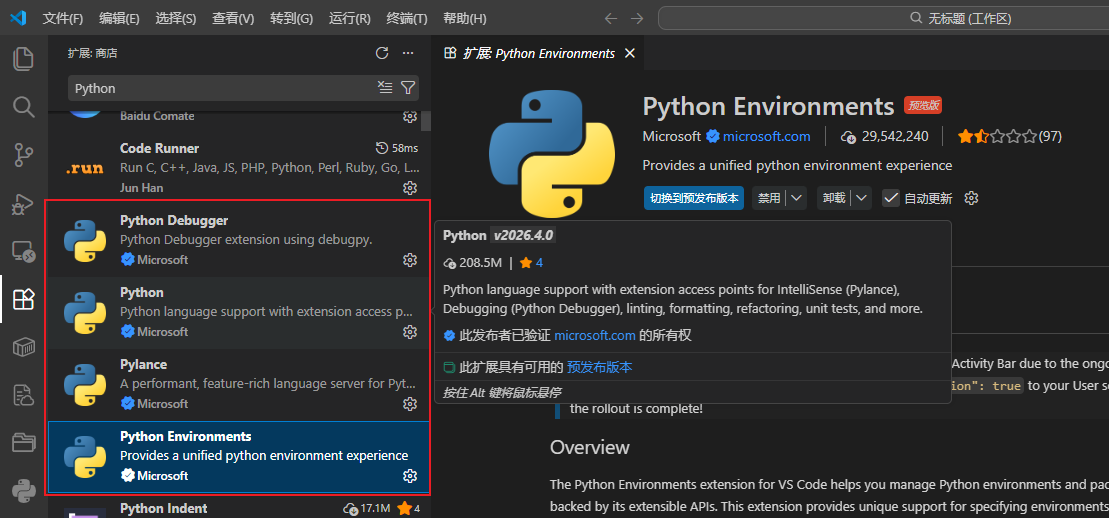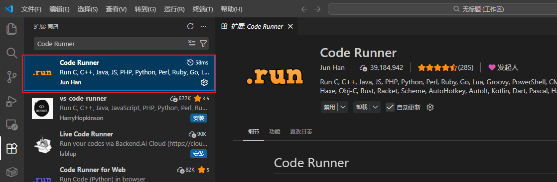 为了快速运行 Python,推荐安装 Code Runner 插件,如下图: