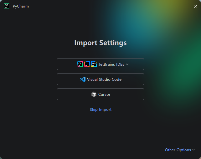 如果你已经在电脑上安装了 JetBrains 的其他产品(如 IDEA、Clion、GridData 等)或 VS CODE,则可以选择将这些软件的配置同步到 PyCharm 中,让 PyCharm 符合你的使用习惯,如界面颜色,快捷键等等。如下图: