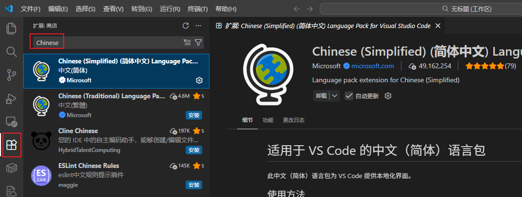 下载完成后,安装 VS CODE 程序(和安装普通软件一样,根据提示一步一步的完成即可)。安装完成后,启动 VS CODE, 如果你不想使用英文版本,可以安装插件“Chinese”进行中文化,如下图: