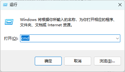 接着,按“Win + R”组合键打开 Windows 的运行窗口,输入 cmd 命令,如下图: