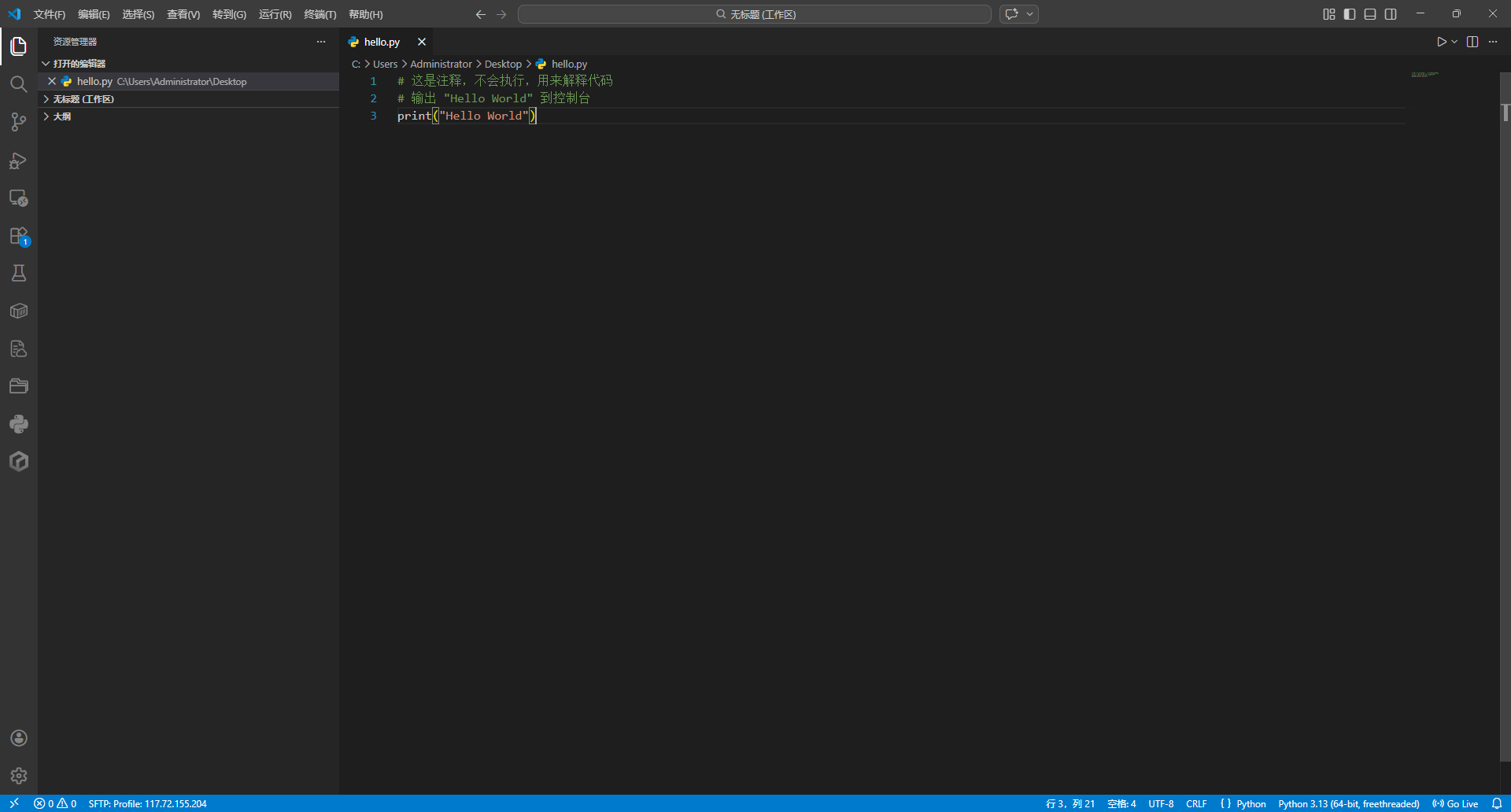 print("Hello World")请使用文本编辑器将上述代码保存到名为 hello.py 的文件中,其中,.py 是 Python 源程序的扩展名,表示这是一个 Python 源程序文件,可以通过扩展名关联到专业的编辑器,类似 .txt、.html 等扩展名。