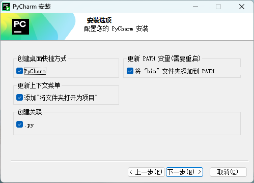 (3)配置 PyCharm,选择是否添加到 Path 环境变量,是否创建快捷方式和关联,选择后点击“下一步”,继续安装,如下图: