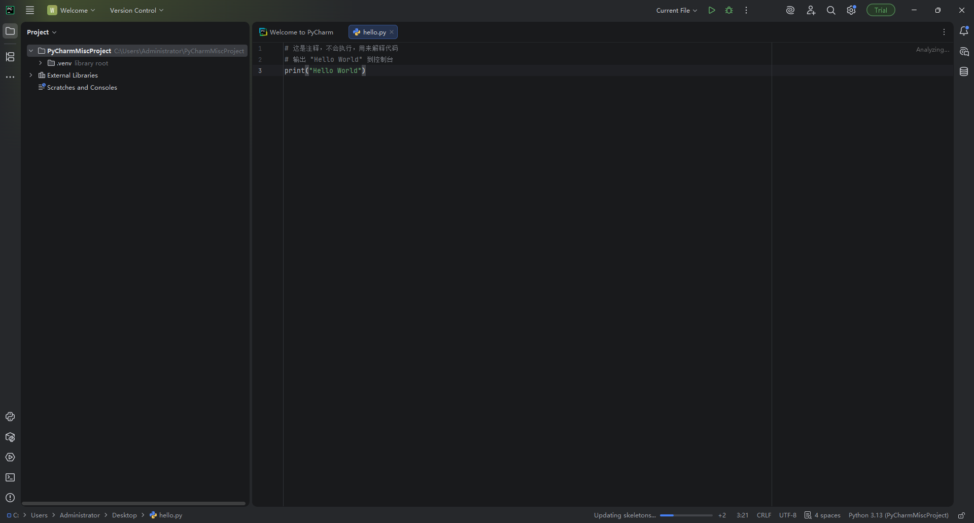 使用 PyCharm 打开上面创建的 hello.py 如下图: