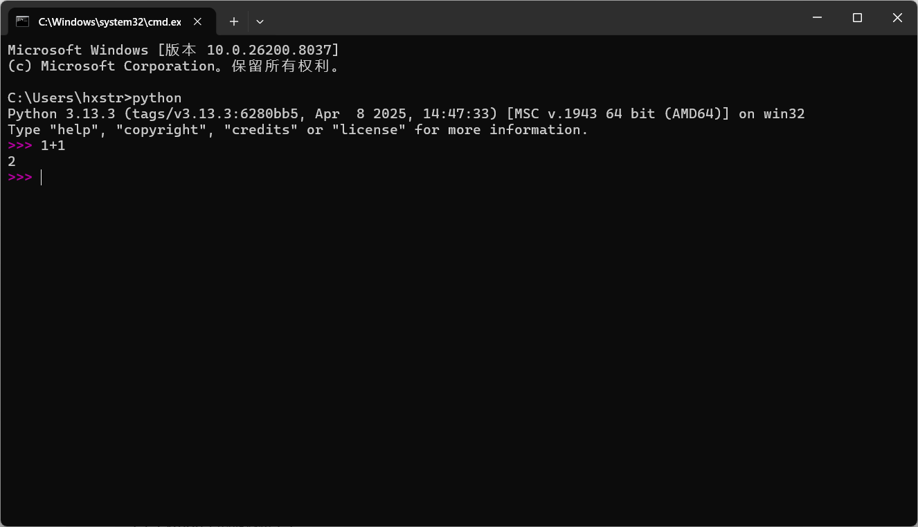 我们可以直接在解释器中运行 Python 代码。注意,这里仅仅适合执行一些很短的语句,不适合编写代码量大的程序。