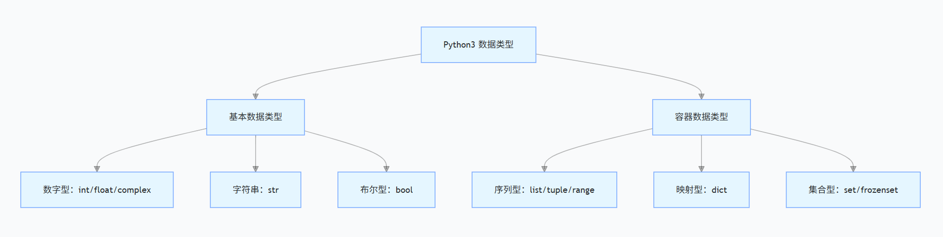 在 Python3 中,数据类型主要分为 6 大类,如下图: