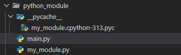 半径为3的圆面积: 28.274333400000003运行成功后,会自动在当前文件所在的目录创建一个名为 __pycache__ 文件夹,其中多了一个 my_module.cpython-313.pyc 文件,如下图: