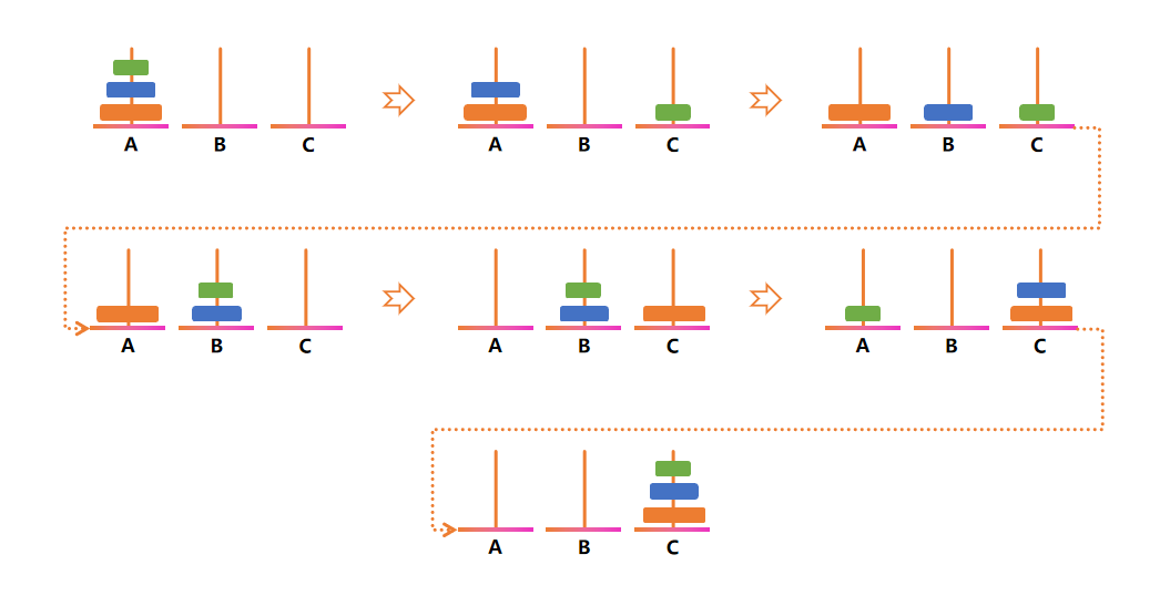 下图演示了拥有 3 个圆盘从 A 移动到 C 的过程: