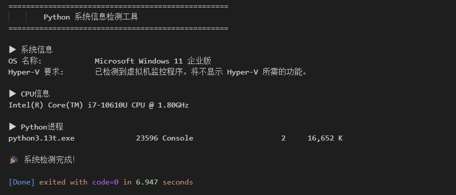[Done] exited with code=0 in 0.268 seconds该示例将执行多条系统命令,捕获这些系统命令的输出、错误、返回码,然后生成格式化报告。