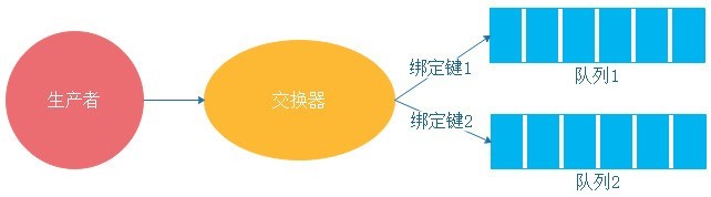 上图中,交换器位于生产者和队列之间。生产者将消息发送给交换器(发送消息时需要指定一个路由键 RoutingKey),交换器根据路由键与绑定键进行匹配(当路由键和绑定键匹配时,消息将被路由到对应的队列中),将消息路由到匹配的队列。