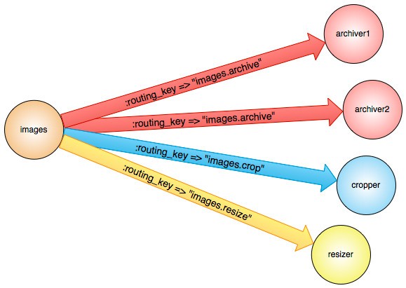 上图中,如果 routing_key 等于“images.archive”,则将消息路由到 archiver1 和 archiver2 队列。如果 routing_key 等于“images.crop”,则将消息路由到 cropper 队列。如果 routing_key 等于“images.resize”,则将消息路由到 resize 队列。