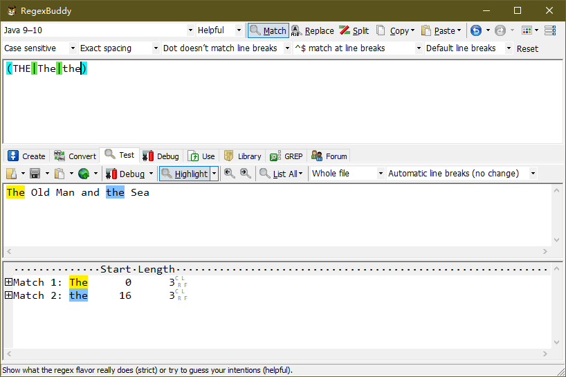 实例:匹配 “The Old Man and the Sea” 中的 the 字符串,不区分大小写。如下图: